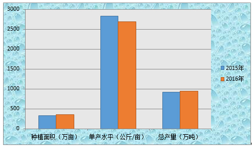 圖1 2015年、2016年中國生姜種植面積、單產(chǎn)水平及總產(chǎn)量