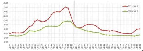 我國是重要的生姜出口國,出口地區(qū)包括中東、東南亞地區(qū)以及歐美、日本、韓國。2016年各月生姜出口量均呈現(xiàn)增加趨勢。但出口價格卻遲遲難漲。一方面,出口量占生產(chǎn)總量比例較低,約3%,對國內(nèi)供需形勢影響有限;另一方面,國外市場對中國生姜需求量占主要地位的多為發(fā)展中國家,對生姜質(zhì)量和價格方面要求不高,帶動國內(nèi)價格上行的作用有限。