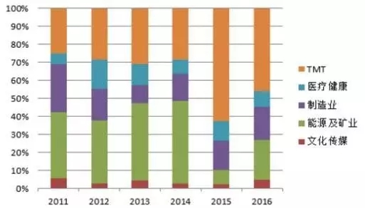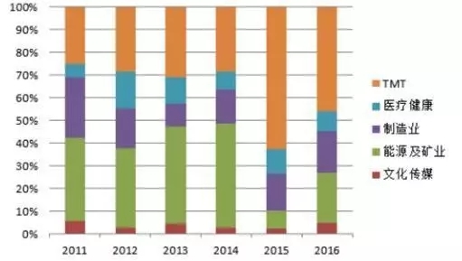 在國(guó)內(nèi) PE 投資方面,2016年TMT 行業(yè)投資熱度有所降低,但這與 2016 年市場(chǎng)整體投資節(jié)奏放緩有一定關(guān)系。如果從投資 的行業(yè)占比來(lái)看,TMT 和制造業(yè)仍然是最受投資機(jī)構(gòu)追捧的領(lǐng)域。
