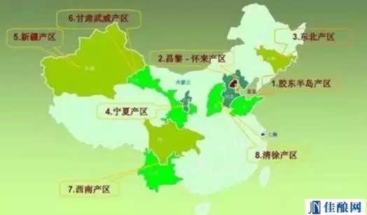 中國的9大葡萄酒地區(qū),分別為東北、河北昌黎、膠東半島、河北懷涿盆地、山西清徐、新疆、甘肅武威、寧夏賀蘭山東部以及西南地區(qū),九個產(chǎn)區(qū)的葡萄表現(xiàn)也獨具風(fēng)格。