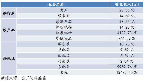 如圖9、10、11是迪安診斷的營業(yè)收入構(gòu)成。按行業(yè)分,營業(yè)收入中,服務(wù)業(yè)占比38.42%,商業(yè)占比61.58%;按產(chǎn)品分,營業(yè)收入中,診斷產(chǎn)品占比61.58%,診斷服務(wù)占比37.14%,健康體檢占比1.08%,冷鏈物流占比0.20%;按地區(qū)分布,營業(yè)收入中,華東區(qū)、華北區(qū)、西北區(qū)、西南區(qū)、東北區(qū)、其他分別占比為43.87%、25.33%、17.50%、7.43%、2.61%、3.26%。