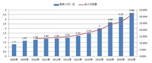 2004年底,中國60歲及以上老年人口為1.43億,2013年我國60歲及以上老年人口達(dá)2億人。截止2016年底,我國60歲以上的老齡人口高達(dá)2.3億人,位居世界之首。20世紀(jì)后期,為控制人口的急劇增長,國家推行計劃生育政策,使得人口出生率迅速下降,加快了中國人口老齡化的進(jìn)程。由于下世紀(jì)前半葉人口壓力仍然沉重,還要繼續(xù)堅持計劃生育的國策,其結(jié)果將不可避免地使中國提早達(dá)到人口老齡化高峰。在第六次全國人口普查主要數(shù)據(jù)顯示,我國60歲及以上人口占13.26%,比2000年人口普查上升2.93個百分點,其中65歲及以上人口占8.87%,比2000年人口普查上升1.91個百分點,而且老年人口比例還以每年超過3%的速度增長,預(yù)計2025年將達(dá)到19.7%,到那時,每五個中國人就有一個是60歲以上的人。按國家統(tǒng)計局2005年出版的報告,現(xiàn)在出生的中國人,男性平均壽命是69.6歲,女性的預(yù)期壽命是73.5歲。