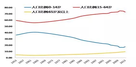 65歲以上老年人占總?cè)丝诘谋壤龔?%提升到14%,發(fā)達(dá)國家大多用了45年以上的時間。中國只用27年就可以完成這個歷程,并且將長時期保持很高的遞增速度,屬于老齡化速度最快國家之列。預(yù)計到2045年左右,中國60歲以上人口將占到總?cè)丝诘?0%。該過程發(fā)達(dá)國家用了100年。圖2為1953年到2013年60年的人口比例變化情況,中國的高齡化趨勢明顯。