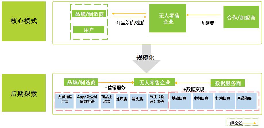 無(wú)人零售企業(yè)收入來(lái)源以銷售商品賺取差價(jià)為主,并且通過(guò)規(guī)?;岣咦h價(jià)能力降低采購(gòu)成本。此外,從加盟商獲取加盟費(fèi)用的商業(yè)模式也已經(jīng)開(kāi)始推行。無(wú)人零售發(fā)展至中后期,企業(yè)數(shù)據(jù)更為龐大,其盈利模式將隨之產(chǎn)生更多的想象空間,以互聯(lián)網(wǎng)思路開(kāi)展?fàn)I銷服務(wù)、數(shù)據(jù)變現(xiàn)等都是比較成熟的可參考模式。
