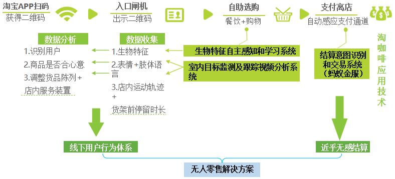2017年7月阿里巴巴在淘寶造物節(jié)上推出無(wú)人便利店淘咖啡。淘咖啡經(jīng)營(yíng)面積約200平米,分成超市區(qū)(無(wú)店員)和餐飲點(diǎn)單區(qū)(有少量店員),可一次性容納客流50人左右。消費(fèi)者通過(guò)手機(jī)淘寶 APP 掃碼進(jìn)店,選購(gòu)?fù)瓿珊笮柰ㄟ^(guò)兩道結(jié)算門,當(dāng)?shù)谝坏篱T感應(yīng)到消費(fèi)者的離店需求時(shí)即會(huì)開(kāi)啟,消費(fèi)者走出第一道門后,系統(tǒng)會(huì)自動(dòng)對(duì)所購(gòu)買商品進(jìn)行識(shí)別與結(jié)算,結(jié)算完成后第二道門自動(dòng)打開(kāi),消費(fèi)者離店。