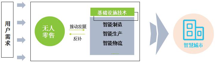 以無(wú)人店和開(kāi)放貨架為代表的無(wú)人零售市場(chǎng)雖然才剛剛開(kāi)始,在政策不斷規(guī)范并且進(jìn)一步鼓勵(lì)無(wú)人零售業(yè)態(tài)發(fā)展的環(huán)境和數(shù)據(jù)、技術(shù)、供應(yīng)鏈等多環(huán)節(jié)共同促進(jìn)下的情況下,無(wú)人零售市場(chǎng)三大業(yè)態(tài)相互配合且與傳統(tǒng)業(yè)態(tài)緊密融合。無(wú)人零售用戶消費(fèi)習(xí)慣將逐漸被培養(yǎng)成熟并且倒逼傳統(tǒng)市場(chǎng)不斷改革(降本增效、提升體驗(yàn)),無(wú)人零售帶動(dòng)智能制造、智能物流等基礎(chǔ)設(shè)施技術(shù)不斷發(fā)展突破,無(wú)人便利店,無(wú)人倉(cāng)庫(kù),無(wú)人機(jī)等之間相互配合,全鏈條智能化空間進(jìn)一步提升。這些技術(shù)的突破又將反補(bǔ)無(wú)人零售行業(yè)的發(fā)展,人們生活便捷度進(jìn)一步提升,成為推動(dòng)智慧城市發(fā)展的要素之一。