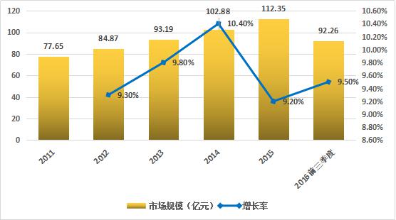 據(jù)統(tǒng)計(jì),2011-2016年前三季度全球α-亞麻酸行業(yè)市場規(guī)模增長率在9%以上。其中,2014年全球α-亞麻酸行業(yè)市場規(guī)模102.88億元,2015年全球α-亞麻酸行業(yè)市場規(guī)模112.35億元,同比增長9.2%。行業(yè)市場增長速度較快,發(fā)展前景較好。