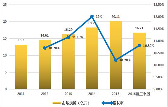 受下游需求市場不斷擴(kuò)大的影響,近幾年中國α-亞麻酸行業(yè)市場處于快速增長期,2011-2016年前三季度中國α-亞麻酸(80%以上)行業(yè)市場規(guī)模增長率在10%-13%之間。其中,2014年中國α-亞麻酸(80%以上)行業(yè)市場規(guī)模18.25億元,2015年中國α-亞麻酸(80%以上)行業(yè)市場規(guī)模20.11億元,同比增長10.2%,行業(yè)市場發(fā)展情況較好。