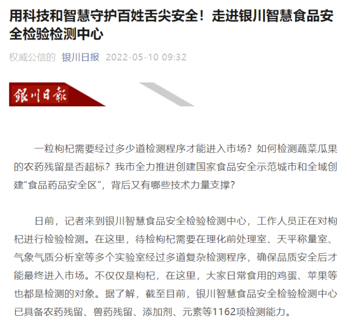 銀川日報(bào)、銀川電視臺宣傳報(bào)道銀川智慧食品安全檢驗(yàn)檢測中心助力銀川市“兩個(gè)創(chuàng)建”